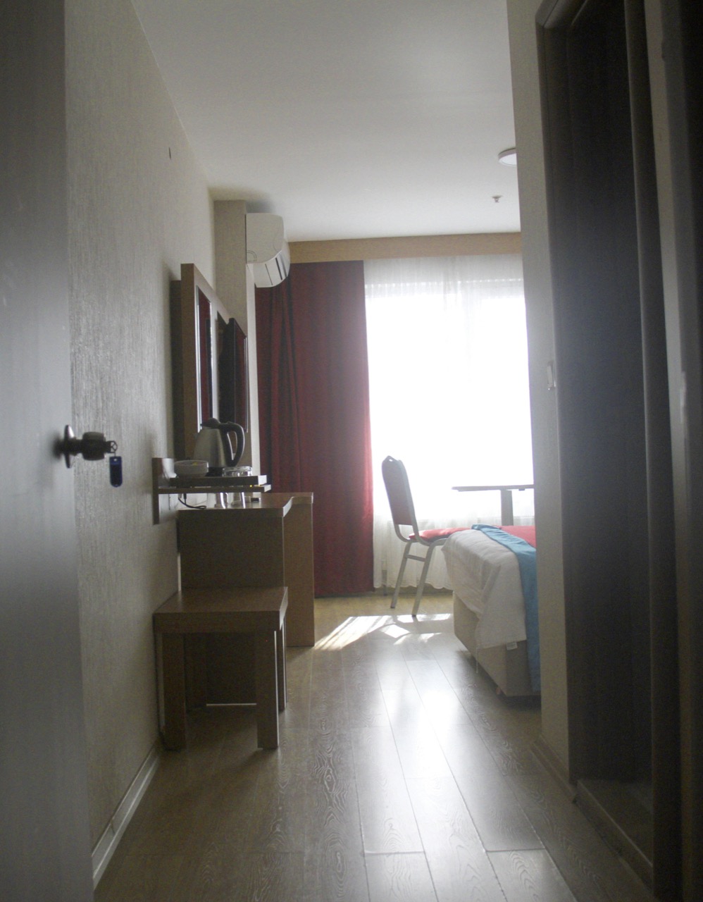 The room features a large window, modern lighting, and practical storage spaces. It offers perfect tranquility for single occupancy and an intimate atmosphere when shared by two. For guests seeking comfort during business trips or short holidays, the "Comfortable Solitude Room" promises a simple yet effective lodging experience.